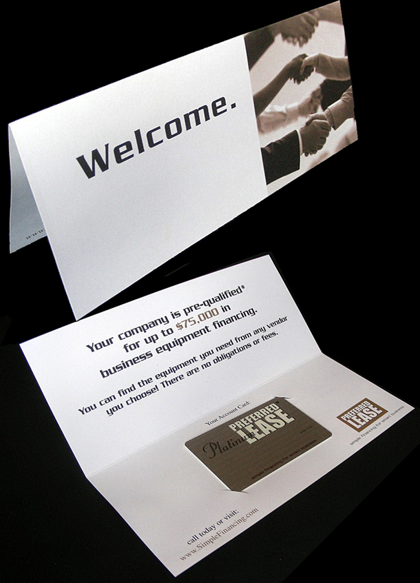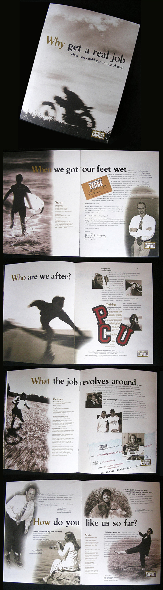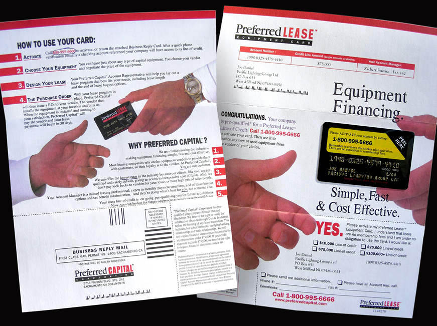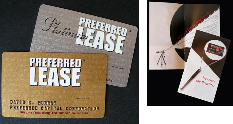 The Assignment: Create all branding for this business equipment financing company. Design, write and coordinate printing production for a “credit card” direct mail campaign. Design and produce myriad additional collateral print pieces. Design/write all employee recruitment material.